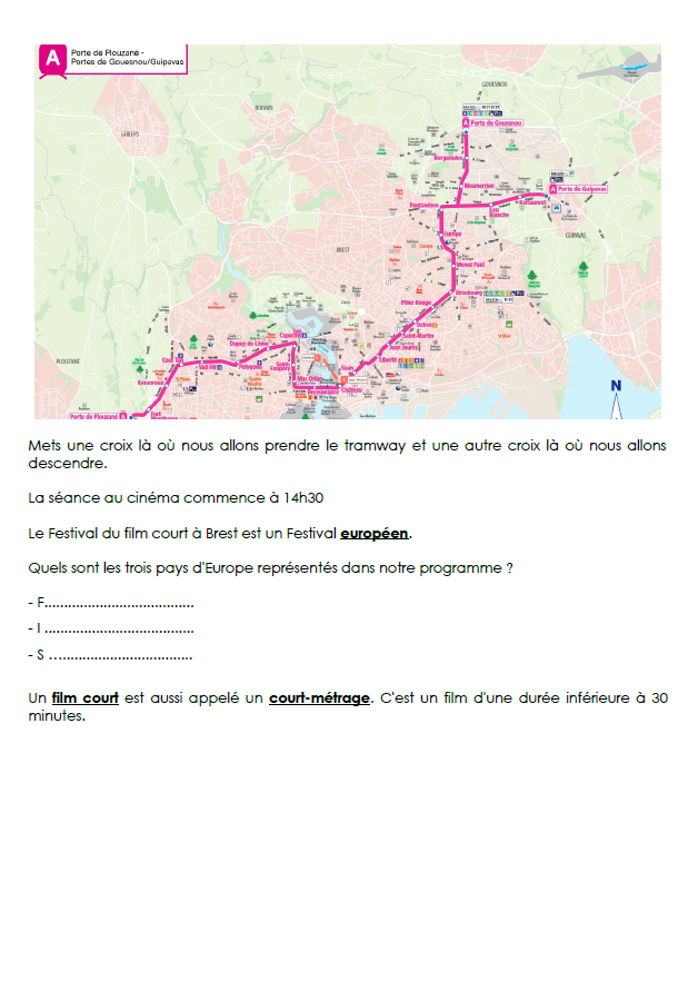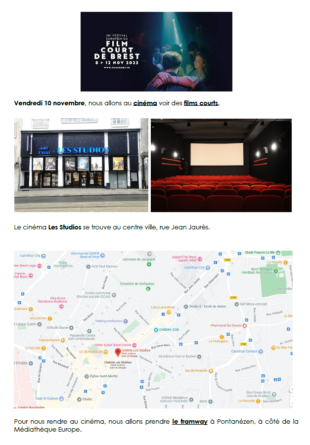 Nous avons marché jusqu’à l’arrêt de tramway à Pontanézen puis nous avons pris le tramway. Nous sommes descendus à l’arrêt Octroi, rue Jean Jaurès. Il y avait d’autres élèves dans la salle de cinéma. C’était bien même si deux films étaient difficiles à comprendre parce qu’ils n’étaient pas en français.